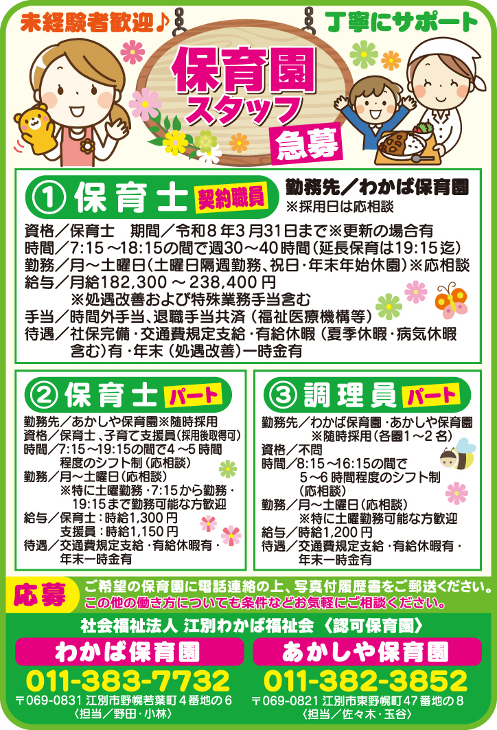 10月10日号掲載 社会福祉法人 江別わかば福祉会 ホーム 10月10日号掲載 社会福祉法人 江別わかば福祉会 職種 保育士契約社員パート 調理員パート 週休二日制 社会保険有 初心者・未経験歓迎 要資格 車通勤可 交通費支給 公開日:2025年10月9日 掲載期間:2025年10月16日まで 労働者募集に関する情報提供日時:2025年1月31日時点 キープ この求人への応募はこちら ご応募またはお問合せ先の表示 ※お電話の際は「まんまるジョブを見て」とお伝え下さい。