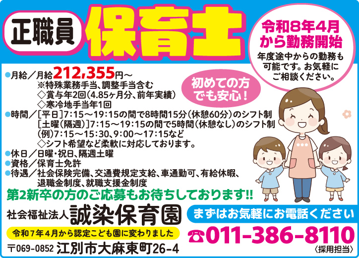 10月10日号掲載 社会福祉法人 誠染保育園 ホーム 10月10日号掲載 社会福祉法人 誠染保育園 職種 保育士正社員 社会保険有 要資格 車通勤可 交通費支給 公開日:2025年10月9日 掲載期間:2025年10月16日まで 労働者募集に関する情報提供日時:2025年10月3日時点 キープ この求人への応募はこちら ご応募またはお問合せ先の表示 0113868110 ※お電話の際は「まんまるジョブを見て」とお伝え下さい。