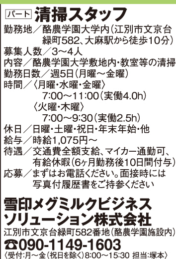 10月24日号掲載 雪印メグミルクビジネスソリューション株式会社 ホーム 雇用形態で探す(パート・アルバイト) 10月24日号掲載 雪印メグミルクビジネスソリューション株式会社 職種 清掃スタッフパート 週休二日制 有給休暇 初心者・未経験歓迎 車通勤可 土日休み 交通費支給 公開日:2025年10月23日 掲載期間:2025年10月31日まで 労働者募集に関する情報提供日時:2025年10月17日時点 キープ この求人への応募はこちら ご応募またはお問合せ先の表示 09011491603 ※お電話の際は「まんまるジョブを見て」とお伝え下さい。