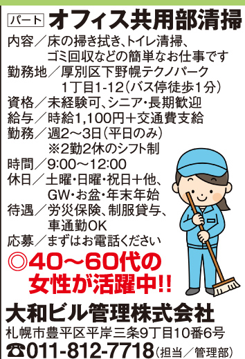 11月7日号掲載 大和ビル管理株式会社 ホーム 雇用形態で探す(パート・アルバイト) 11月7日号掲載 大和ビル管理株式会社 職種 オフィス共用部清掃パート 週休二日制 制服貸与 扶養控除内OK 初心者・未経験歓迎 車通勤可 交通費支給 公開日:2025年11月6日 掲載期間:2025年11月13日まで 労働者募集に関する情報提供日時:2025年10月31日時点 キープ この求人への応募はこちら ご応募またはお問合せ先の表示 0118127718 ※お電話の際は「まんまるジョブを見て」とお伝え下さい。