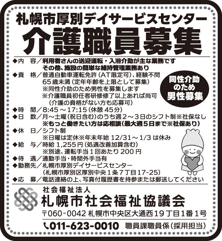 1月9日号掲載 社会福祉法人 札幌市社会福祉協議会 ホーム 雇用形態で探す(パート・アルバイト) 1月9日号掲載 社会福祉法人 札幌市社会福祉協議会 職種 介護職員パート 社会保険有 初心者・未経験歓迎 交通費支給 公開日:2026年1月8日 掲載期間:2026年1月15日まで 労働者募集に関する情報提供日時:2025年12月26日時点 キープ この求人への応募はこちら ご応募またはお問合せ先の表示 0116290010 ※お電話の際は「まんまるジョブを見て」とお伝え下さい。