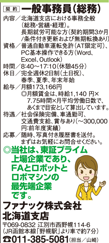 1月16日号掲載 ファナック株式会社 北海道支店 ホーム 1月16日号掲載 ファナック株式会社 北海道支店 職種 一般事務員(総務)契約社員 制服貸与 社会保険有 車通勤可 交通費支給 公開日:2026年1月15日 掲載期間:2026年1月22日まで 労働者募集に関する情報提供日時:2026年1月9日時点 キープ この求人への応募はこちら ご応募またはお問合せ先の表示 0113855081 ※お電話の際は「まんまるジョブを見て」とお伝え下さい。
