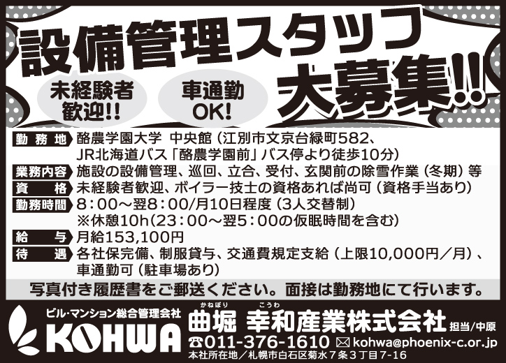 1月23日号掲載 曲堀 幸和産業株式会社 ホーム 雇用形態で探す(パート・アルバイト) 1月23日号掲載 曲堀 幸和産業株式会社 職種 設備管理スタッフパート 制服貸与 社会保険有 車通勤可 交通費支給 公開日:2026年1月22日 掲載期間:2026年1月29日まで 労働者募集に関する情報提供日時:2026年1月16日時点 キープ この求人への応募はこちら ご応募またはお問合せ先の表示 0113761610 ※お電話の際は「まんまるジョブを見て」とお伝え下さい。