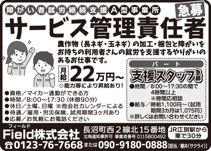 1月30日号掲載 Field株式会社 ホーム 1月30日号掲載 Field株式会社 職種 サービス管理責任者正社員 公開日:2026年1月29日 掲載期間:2026年2月5日まで 労働者募集に関する情報提供日時:2026年1月23日時点 キープ この求人への応募はこちら ご応募またはお問合せ先の表示 0123767668 ※お電話の際は「まんまるジョブを見て」とお伝え下さい。