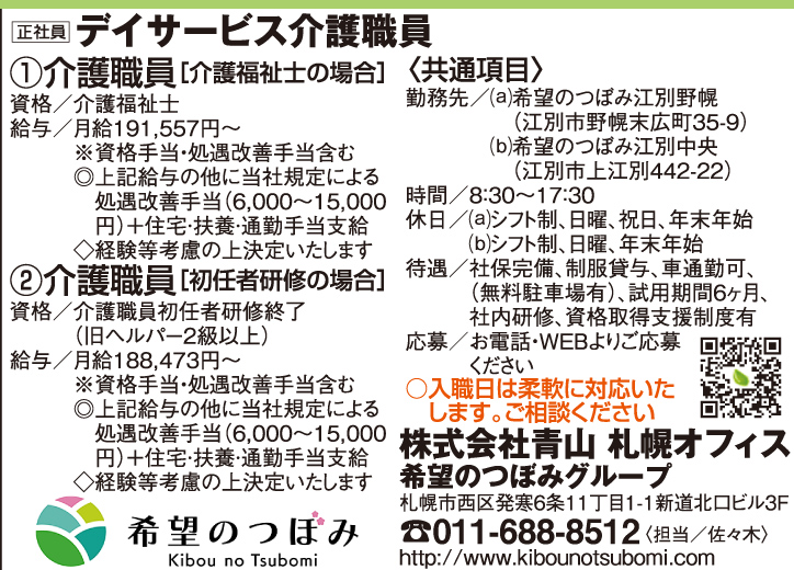 2月6日号掲載 株式会社青山 札幌オフィス 希望のつぼみグループ ホーム 雇用形態で探す(正社員・正職員) 2月6日号掲載 株式会社青山 札幌オフィス 希望のつぼみグループ 職種 デイサービススタッフ介護職員正社員 制服貸与 社会保険有 車通勤可 交通費支給 公開日:2026年2月5日 掲載期間:2026年2月12日まで 労働者募集に関する情報提供日時:2026年1月30日時点 キープ この求人への応募はこちら ご応募またはお問合せ先の表示 0116888512 ※お電話の際は「まんまるジョブを見て」とお伝え下さい。