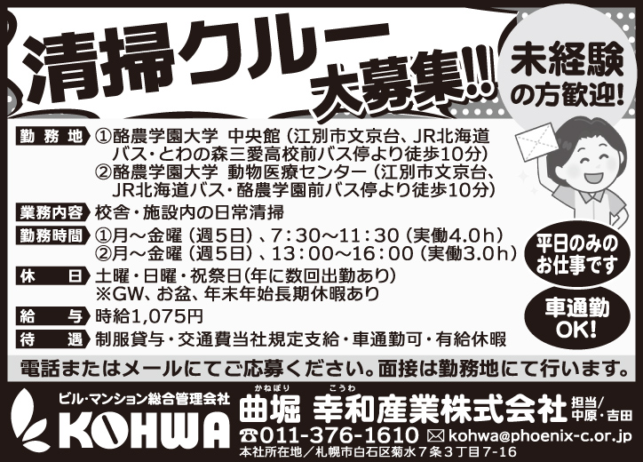 2月6日号掲載 曲堀 幸和産業株式会社 ホーム 2月6日号掲載 曲堀 幸和産業株式会社 職種 清掃クルーパート 有給休暇 制服貸与 初心者・未経験歓迎 車通勤可 交通費支給 公開日:2026年2月5日 掲載期間:2026年2月12日まで 労働者募集に関する情報提供日時:2026年1月30日時点 キープ この求人への応募はこちら ご応募またはお問合せ先の表示 0113761610 ※お電話の際は「まんまるジョブを見て」とお伝え下さい。