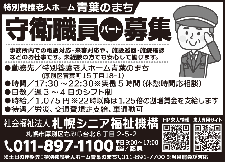 2月13日号掲載 社会福祉法人 札幌シニア福祉機構 ホーム 雇用形態で探す(パート・アルバイト) 2月13日号掲載 社会福祉法人 札幌シニア福祉機構 職種 守衛職員パート 制服貸与 車通勤可 交通費支給 公開日:2026年2月12日 掲載期間:2026年2月19日まで 労働者募集に関する情報提供日時:2026年2月6日時点 キープ この求人への応募はこちら ご応募またはお問合せ先の表示 0118971100 ※お電話の際は「まんまるジョブを見て」とお伝え下さい。