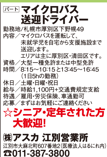 2月27日号掲載 ㈱アスカ 江別営業所 ホーム 雇用形態で探す(パート・アルバイト) 2月27日号掲載 ㈱アスカ 江別営業所 職種 マイクロバス送迎ドライバーパート 普通自動車免許 車通勤可 土日休み 交通費支給 公開日:2026年2月26日 掲載期間:2026年3月5日まで 労働者募集に関する情報提供日時:2026年2月20日時点 キープ この求人への応募はこちら ご応募またはお問合せ先の表示 0113873800 ※お電話の際は「まんまるジョブを見て」とお伝え下さい。