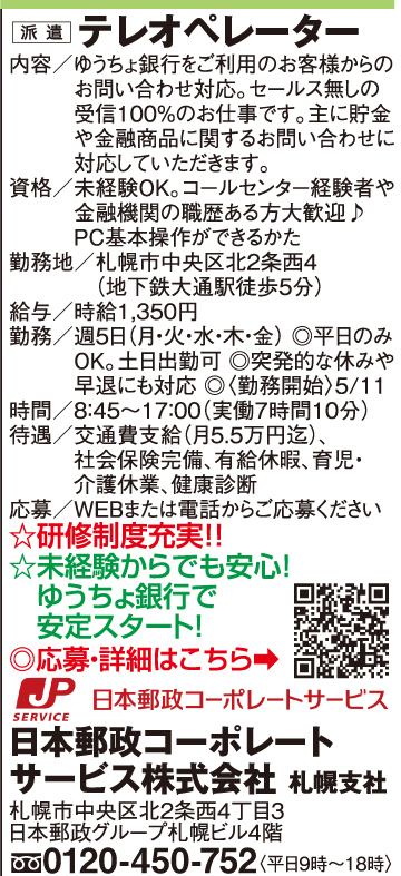 2月27日号掲載 日本郵政コーポレートサービス株式会社 札幌支店 ホーム 雇用形態で探す(人材派遣・紹介) 2月27日号掲載 日本郵政コーポレートサービス株式会社 札幌支店 職種 テレオペレーター派遣 週休二日制 有給休暇 社会保険有 車通勤可 交通費支給 公開日:2026年2月26日 掲載期間:2026年3月5日まで 労働者募集に関する情報提供日時:2026年2月20日時点 キープ この求人への応募はこちら ご応募またはお問合せ先の表示 0120450752 ※お電話の際は「まんまるジョブを見て」とお伝え下さい。