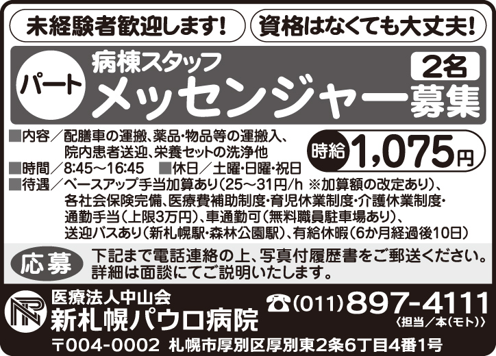 3月6日号掲載 医療法人中山会 新札幌パウロ病院 ホーム 3月6日号掲載 医療法人中山会 新札幌パウロ病院 職種 メッセンジャーパート 送迎付 社会保険有 初心者・未経験歓迎 車通勤可 交通費支給 公開日:2026年3月5日 掲載期間:2026年3月12日まで 労働者募集に関する情報提供日時:2026年2月27日時点 キープ この求人への応募はこちら ご応募またはお問合せ先の表示 0118974111 ※お電話の際は「まんまるジョブを見て」とお伝え下さい。