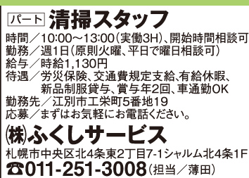 3月6日号掲載 (株)ふくしサービス ホーム 雇用形態で探す(パート・アルバイト) 3月6日号掲載 (株)ふくしサービス 職種 清掃スタッフパート 有給休暇 制服貸与 賞与有 交通費支給 公開日:2026年3月9日 掲載期間:2026年3月12日まで 労働者募集に関する情報提供日時:2026年2月27日時点 キープ この求人への応募はこちら ご応募またはお問合せ先の表示 0112513008 ※お電話の際は「まんまるジョブを見て」とお伝え下さい。