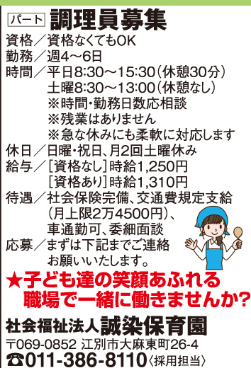 3月6日号掲載 社会福祉法人 誠染保育園 ホーム 雇用形態で探す(パート・アルバイト) 3月6日号掲載 社会福祉法人 誠染保育園 職種 調理員パート 社会保険有 車通勤可 交通費支給 公開日:2026年3月9日 掲載期間:2026年3月12日まで 労働者募集に関する情報提供日時:2026年2月27日時点 キープ この求人への応募はこちら ご応募またはお問合せ先の表示 0113868110 ※お電話の際は「まんまるジョブを見て」とお伝え下さい。
