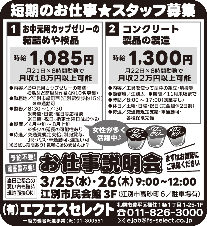 3月20日号掲載 ㈲エフエスセレクト ホーム 雇用形態で探す(人材派遣・紹介) 3月20日号掲載 ㈲エフエスセレクト 職種 お中元用カップゼリーの箱詰めや仕分けスタッフ契約社員コンクリート製品の製造契約社員 制服貸与 短期勤務 車通勤可 交通費支給 公開日:2026年3月19日 掲載期間:2026年4月2日まで 労働者募集に関する情報提供日時:2026年3月13日時点 キープ この求人への応募はこちら ご応募またはお問合せ先の表示 0118263000 ※お電話の際は「まんまるジョブを見て」とお伝え下さい。