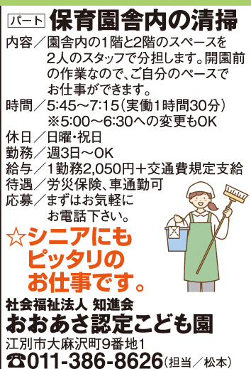 3月20日号掲載 おおあさ認定こども園 ホーム 雇用形態で探す(パート・アルバイト) 3月20日号掲載 おおあさ認定こども園 職種 保育園舎内の清掃スタッフパート 車通勤可 シニア歓迎 交通費支給 公開日:2026年3月19日 掲載期間:2026年4月2日まで 労働者募集に関する情報提供日時:2026年3月13日時点 キープ この求人への応募はこちら ご応募またはお問合せ先の表示 0113868626 ※お電話の際は「まんまるジョブを見て」とお伝え下さい。