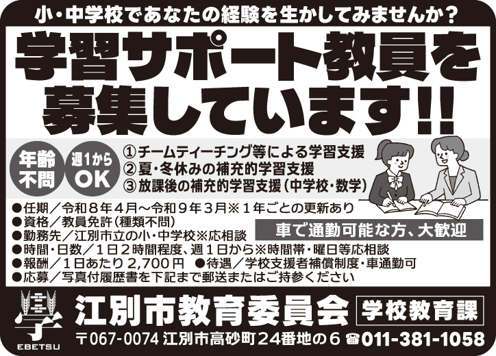 3月20日号掲載 江別市教育委員会 学校教育課 ホーム 雇用形態で探す(契約社員) 3月20日号掲載 江別市教育委員会 学校教育課 職種 学習サポート教員契約社員 賞与有 公開日:2026年3月19日 掲載期間:2026年4月2日まで 労働者募集に関する情報提供日時:2026年3月13日時点 キープ この求人への応募はこちら ご応募またはお問合せ先の表示 0113811058 ※お電話の際は「まんまるジョブを見て」とお伝え下さい。